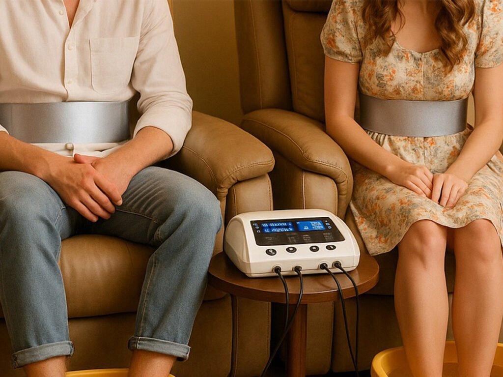 Dual ionic foot bath promotes detox, warmth, and circulation. Color changes reflect your body condition.